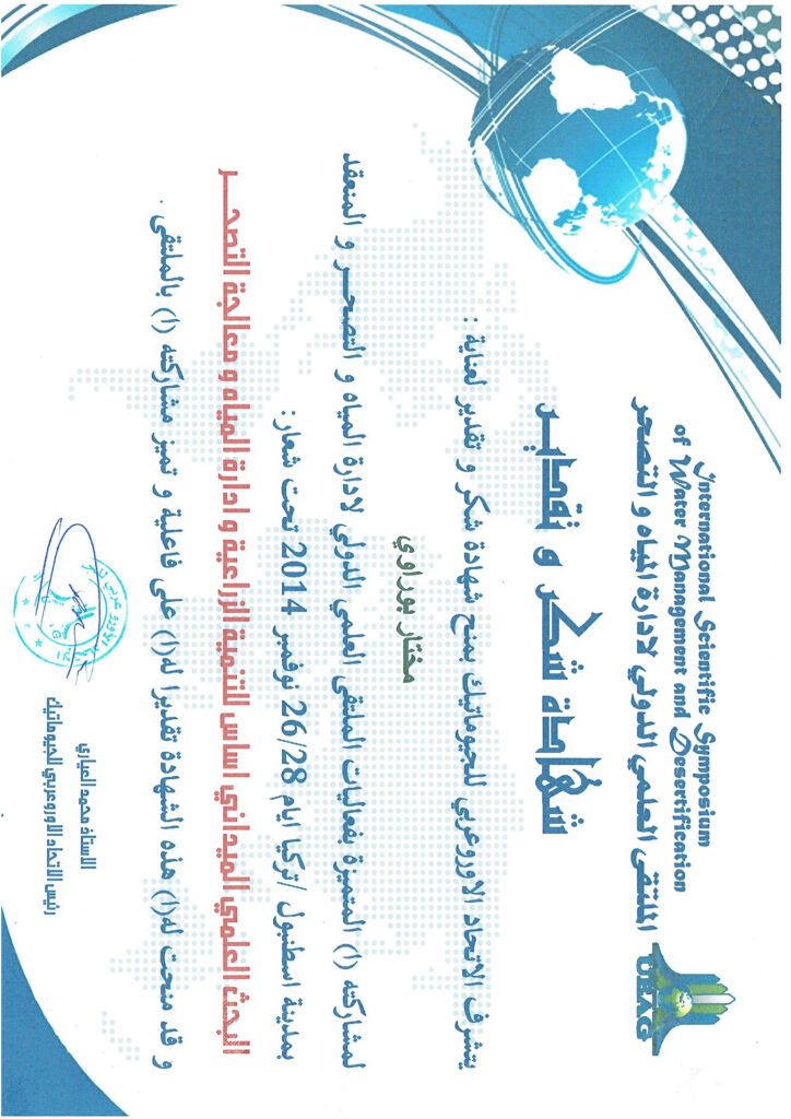 - Colloque scientifique international de la gestion de l’eau et de la désertification. Istanbul 2014.