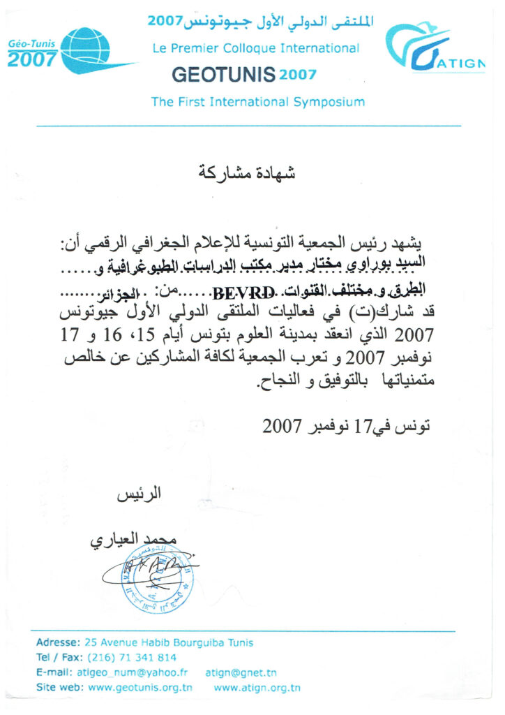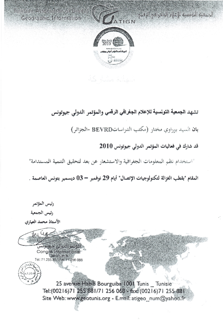 Le SARL BEVRD a participé à plusieurs séminaires et colloques internationaux sur les systèmes d’information géographique SIG, on cite entre autre: